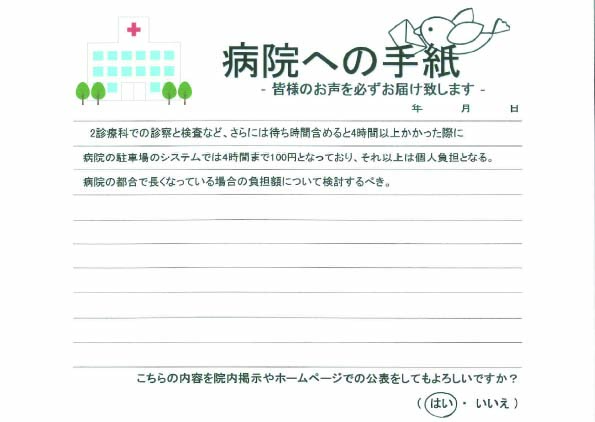 現在、駐車場の運営会社と機械設定などの協議を行なっておりますので少しお時間いただきますが、4時間を超えた診療の際は自己負担100円での駐車場利用になるようにさせていただきます。