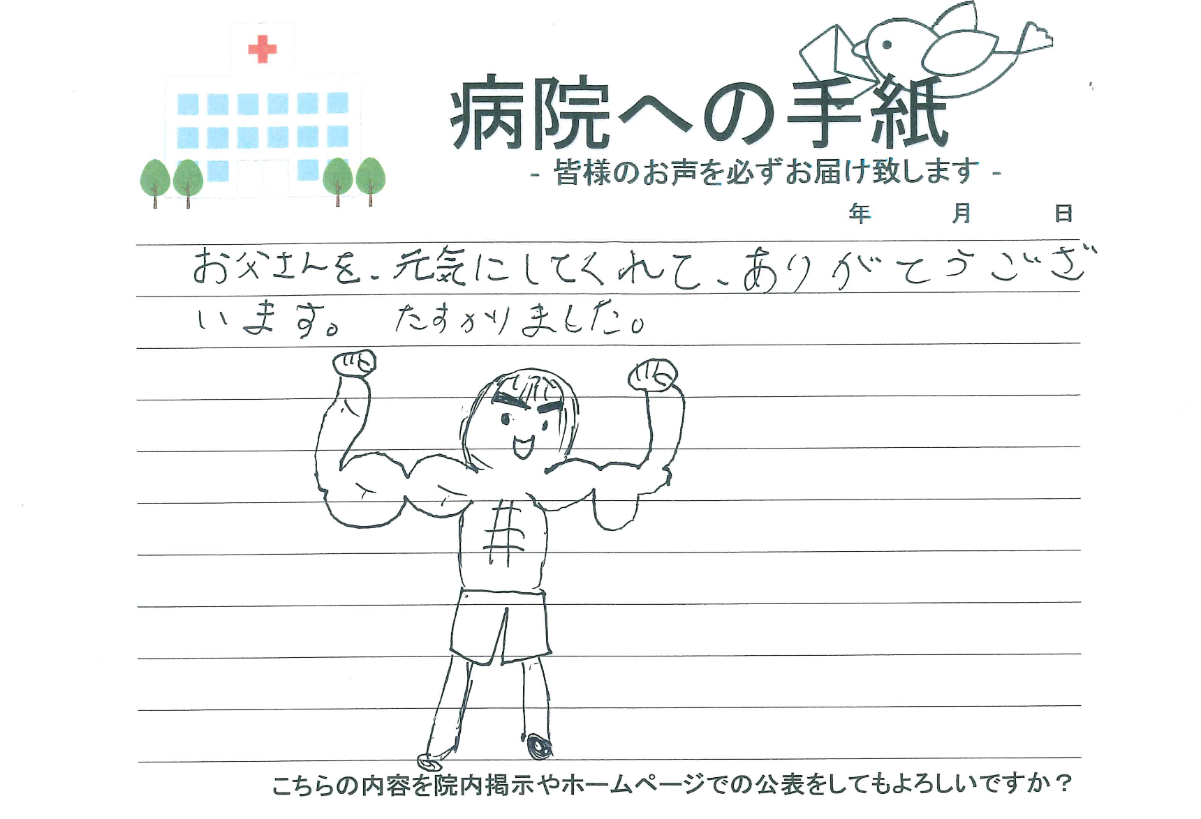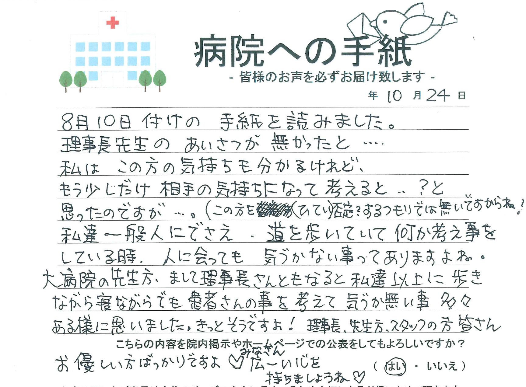 先日頂戴したお声は重く受け止め、もう一度自身を律し、サービス業を統括する者として適切な行動を心がけております。「病院への手紙」を通じて患者様からの様々なご意見をいただけること、大変有り難く存じます。