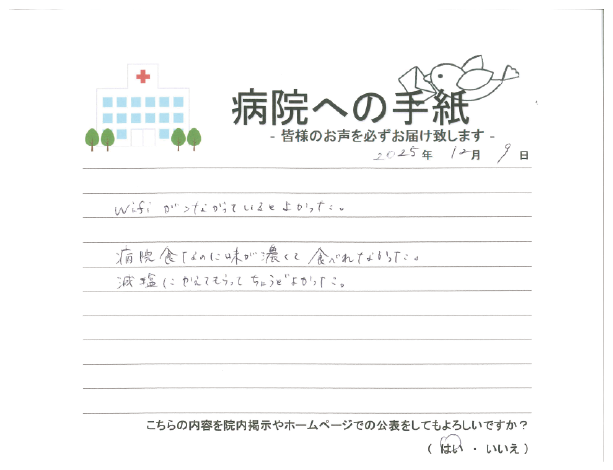病院食につきましては、すべての患者様に安心かつおいしく召し上がっていただけるように、当院厨房で調理しておりますが、お口に合わない場合もあるかと思います。
